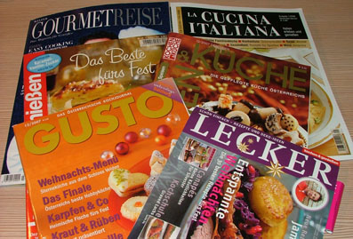 Nincs kedvenc gasztronómiai lapom. Egyrészt, mert sok esetben találom szemben magam olyan recepttel, amit ha, megfőztek volna a megadott összetevőkkel, biztosan nem a képen látható végeredményt adja, másrészt jelenleg nincs olyan gasztronómiával foglalkozó újság, ami az átlagnál kicsit jobban főző/főzést jobban kedvelő réteget szolgálná ki. Van, amely a csúcsgasztronómiával foglalkozik és példaértékű a cikkek sziínvonalát illetve a szerkesztését, átgondoltáságát illetően. Mégis vásárolok ilyesfajta újságokat (TV Paprika magazin, Nők Lapja Konya, Fakanál), mivel a képeket nézegetve inspirálnak. Nagyjából az általam olvasott gasztroblogok is ezt teszik, úgyhogy a papíralapú termékek megvásárlásáról hamarosan le is szoktatom magam. Úgyis rengeteg van már. Érdekes volt áttekintenem a németajkú lapokat. Nagy az eltérés a ma itthon megjelenőkkel szemben. Szellősebbek, átgondoltabbak. Kifejezettem tetszett a La Cucina Italiana és az osztrák Gusto, rengeteg ötlet és klassz recept lelőhelye. Mivel jobbnál-jobb karácsonyi sütirecepteket is találtam ezekben, eldöntöttem, idén csak az “osztrák” sütik nyomán indulok el.:-)